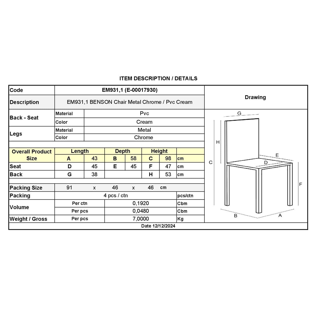 ΕΜ931,1 BENSON Καρέκλα Χρώμιο/Pvc Εκρού
