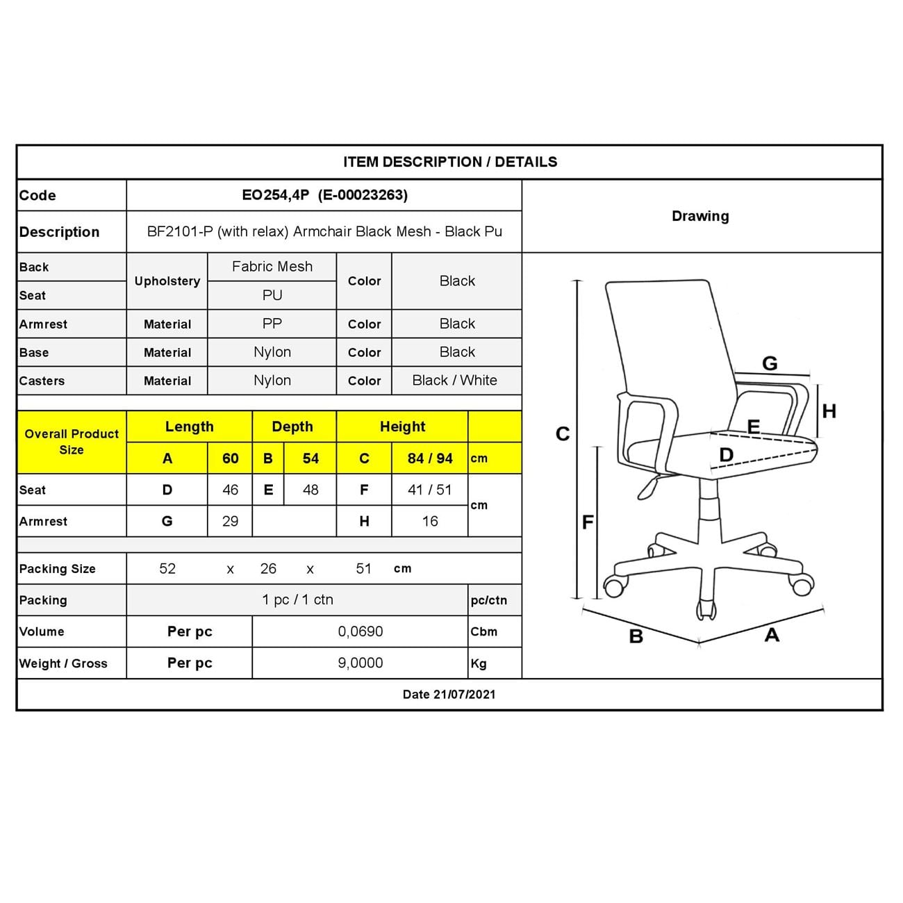 ΕΟ254,4P BF2101-P (με ανάκλιση) Bάση Nylon Πολυθρόνα Μαύρο Mesh-Pu (Συσκ.1)