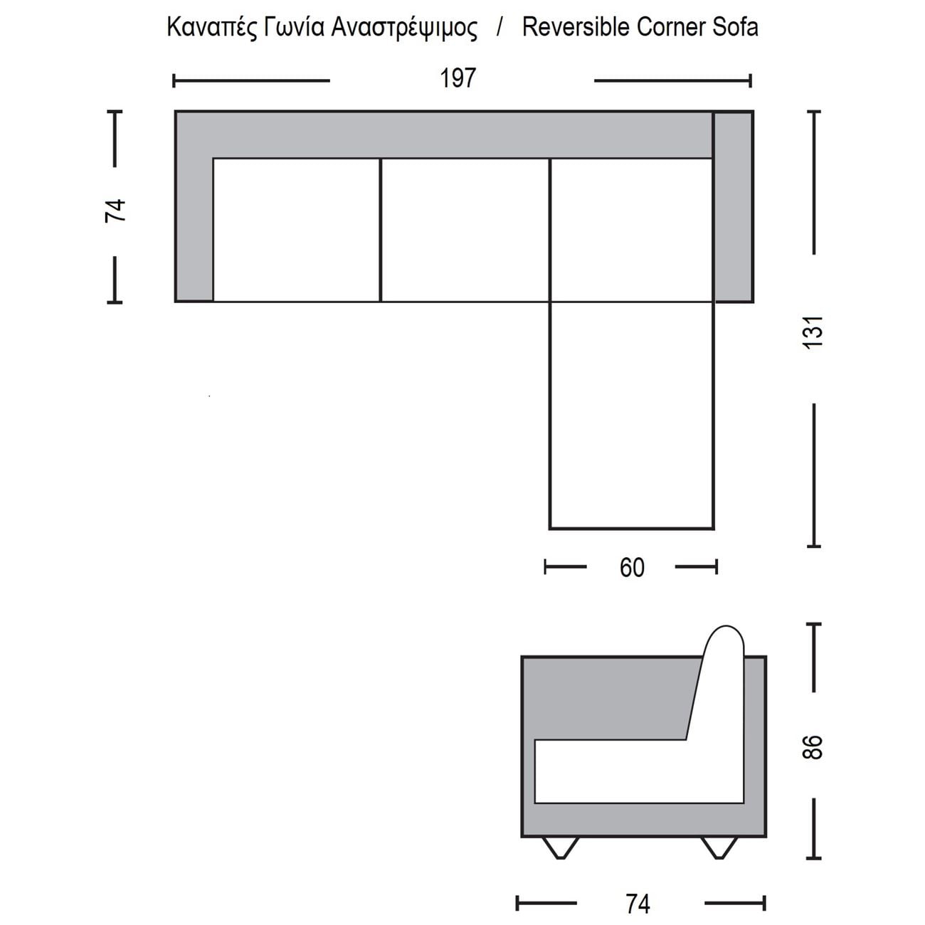 Γωνιακός καναπές, με δυνατότητα τοποθέτησης της γωνίας δεξιά ή αριστερά.