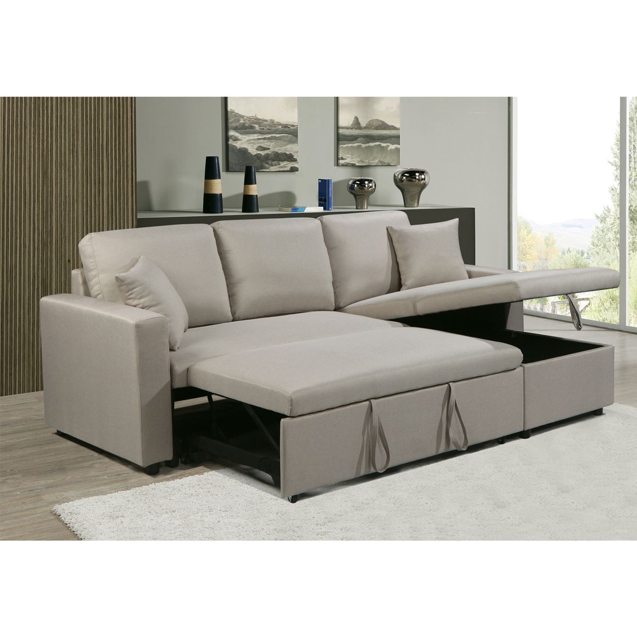 Καναπές-Κρεβάτι με αποθηκευτικό χώρο και αναστρέψιμη γωνία, με ύφασμα σε χρώμα Μπεζ.