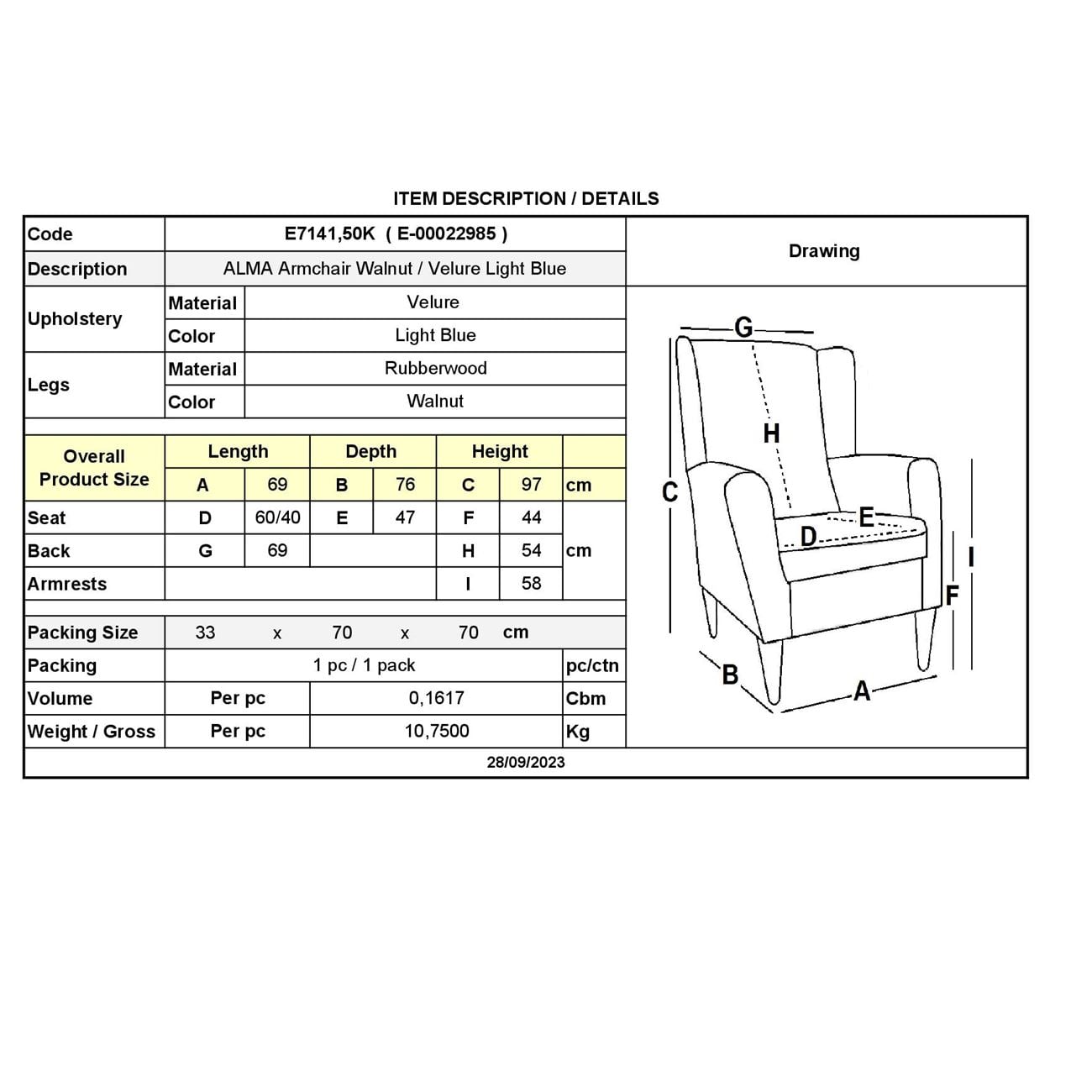Πολυθρόνα, με ύφασμα Velure σε χρώμα Ανοιχτό Μπλε.