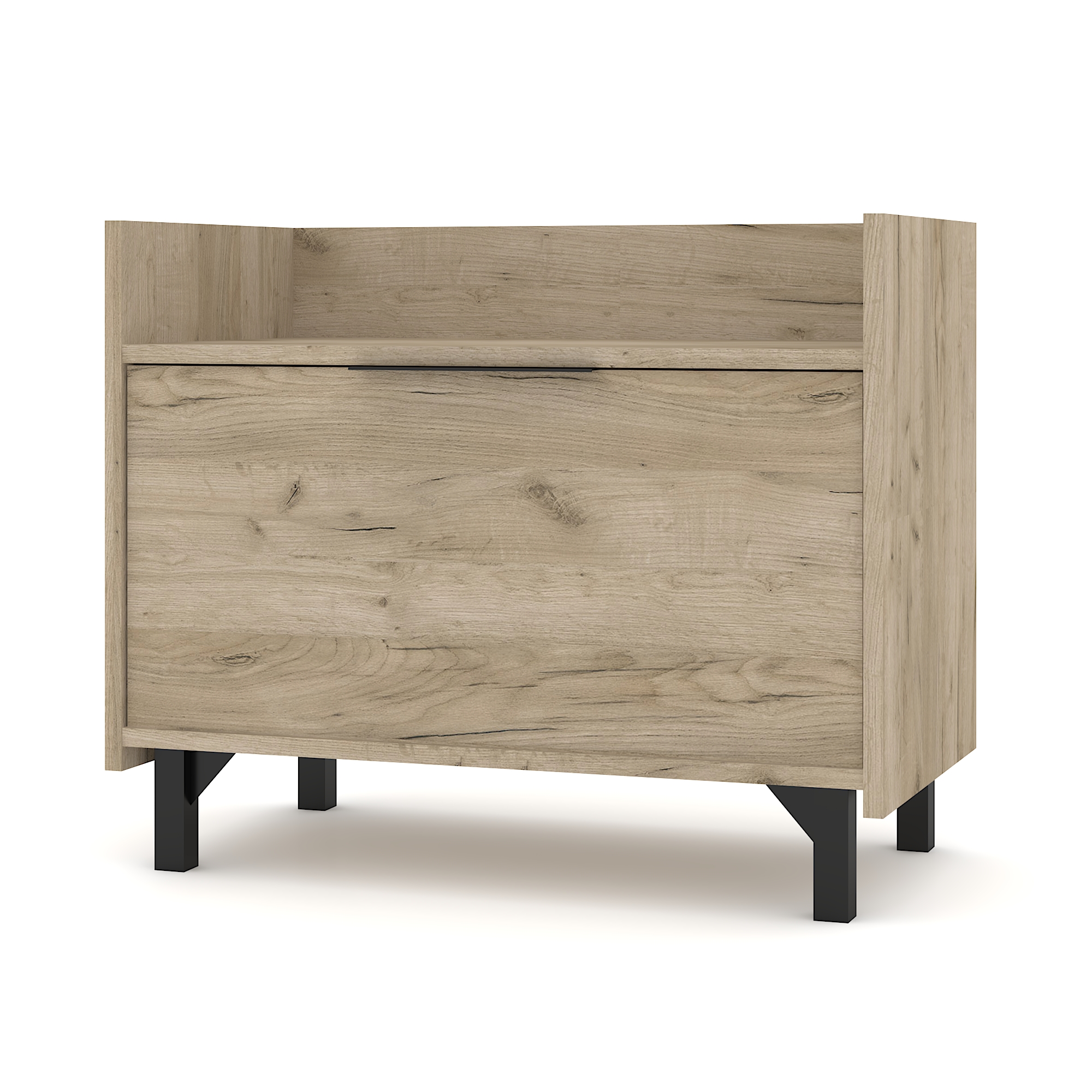 Κομοδίνο με ένα συρτάρι Dawn σε λιτή γραμμή. Το Grey Craft Oak είναι δυνατό και εκφραστικό ντεκόρ ξύλου. Διαθέτει μείγμα από μπεζ και γκρι αποχρώσεις και αυθεντική υφή με ορατές ρωγμές και ρόζους. Εκπέμπει χαρακτήρα με τις φυσικές ατέλειές του.