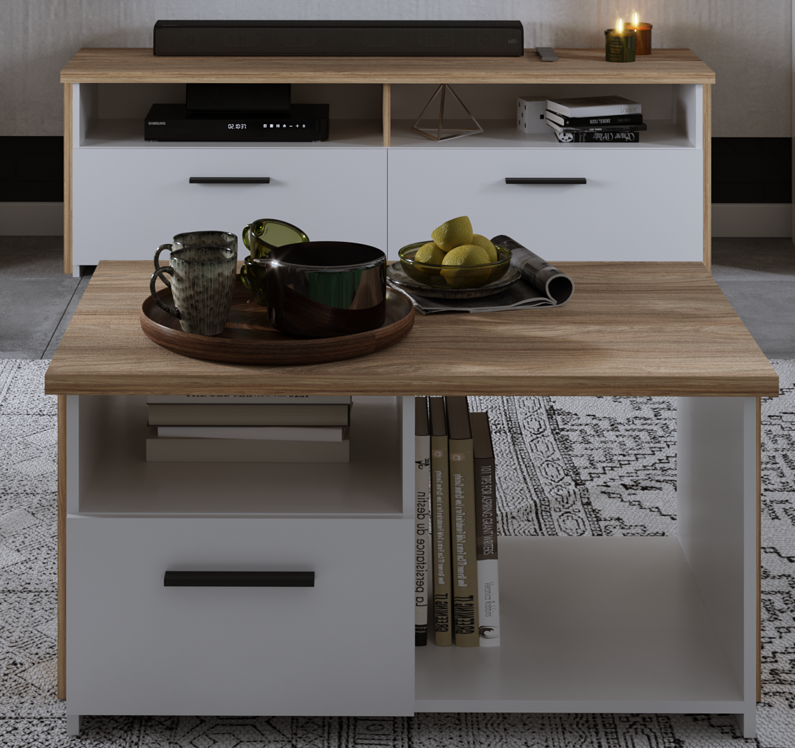 Τραπεζάκι σαλονιού Moon με αποθηκευτικό χώρο. Μοντέρνος σχεδιασμός που συνδυάζει χρηστικότητα και αισθητική. Το Grey Craft Oak είναι δυνατό και εκφραστικό ντεκόρ ξύλου. Διαθέτει μείγμα από μπεζ και γκρι αποχρώσεις και αυθεντική υφή με ορατές ρωγμές και ρόζους. Εκπέμπει χαρακτήρα με τις φυσικές ατέλειές του. Το Charcoal Flow ξεχωρίζει με τις αποχρώσεις του ασημί και του γκρι ατσαλιού. Συνδυάζεται υπέροχα με πιο ανοιχτόχρωμα μονόχρωμα ντεκόρ, καθώς και με ντεκόρ ξύλου.