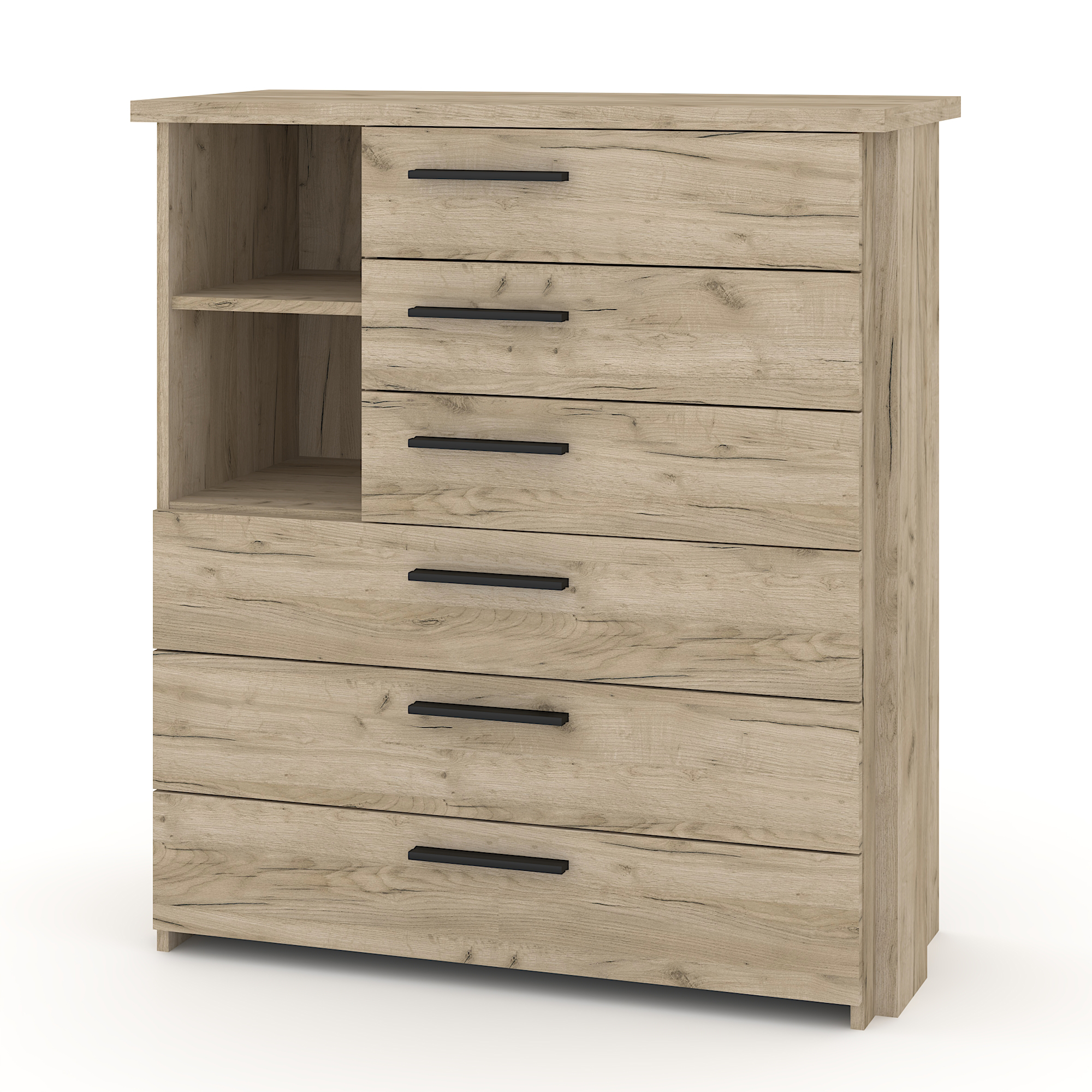 Συρταριέρα Moon με 6 συρτάρια κα 2 ράφια. Αποθήκευση υπνοδωματίου με μοντέρνο design. Το Grey Craft Oak είναι δυνατό και εκφραστικό ντεκόρ ξύλου. Διαθέτει μείγμα από μπεζ και γκρι αποχρώσεις και αυθεντική υφή με ορατές ρωγμές και ρόζους. Εκπέμπει χαρακτήρα με τις φυσικές ατέλειές του.