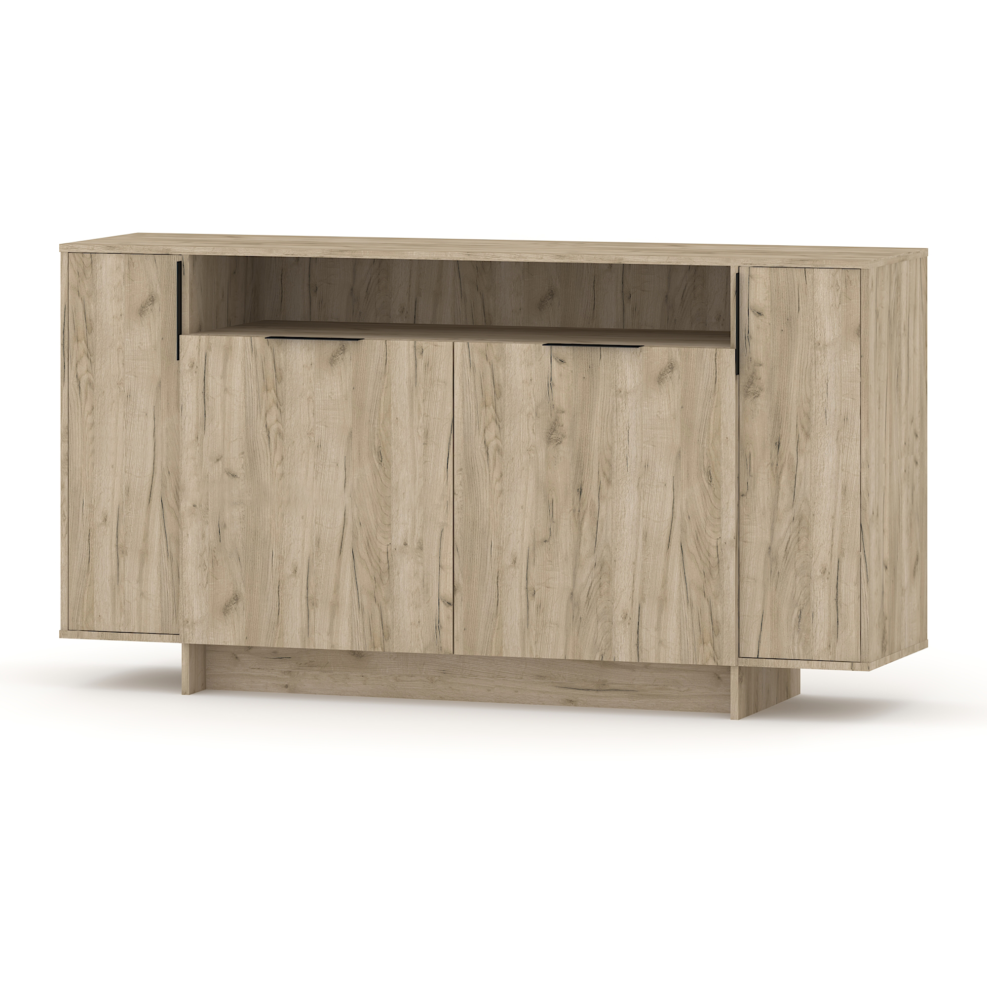 Μπουφές Rain σε λιτή γραμμή με ντουλάπια κι ένα ράφι. Το Grey Craft Oak είναι δυνατό και εκφραστικό ντεκόρ ξύλου. Διαθέτει μείγμα από μπεζ και γκρι αποχρώσεις και αυθεντική υφή με ορατές ρωγμές και ρόζους. Εκπέμπει χαρακτήρα με τις φυσικές ατέλειές του.