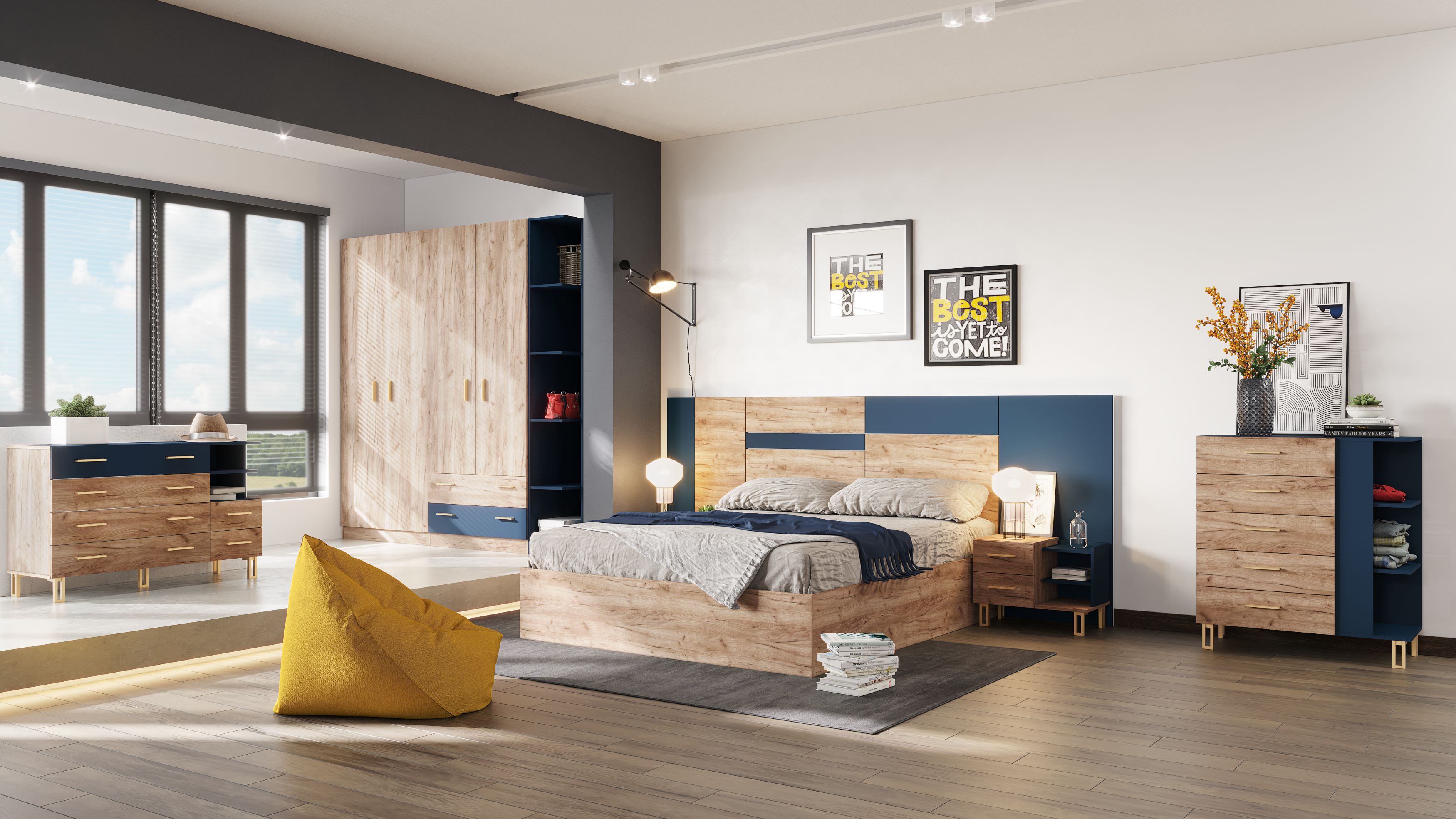 Σετ υπνοδωματίου, σε απόχρωση K004 Tobacco Craft Oak και 8984 Navy Blue.