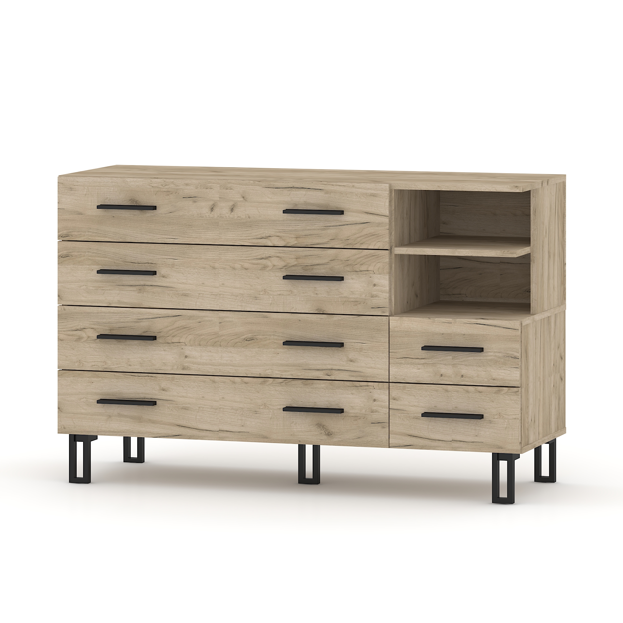 Συρταριέρα Dust με 6 συρτάρια και 2 ράφια. Το Grey Craft Oak είναι δυνατό και εκφραστικό ντεκόρ ξύλου. Διαθέτει μείγμα από μπεζ και γκρι αποχρώσεις και αυθεντική υφή με ορατές ρωγμές και ρόζους. Εκπέμπει χαρακτήρα με τις φυσικές ατέλειές του.