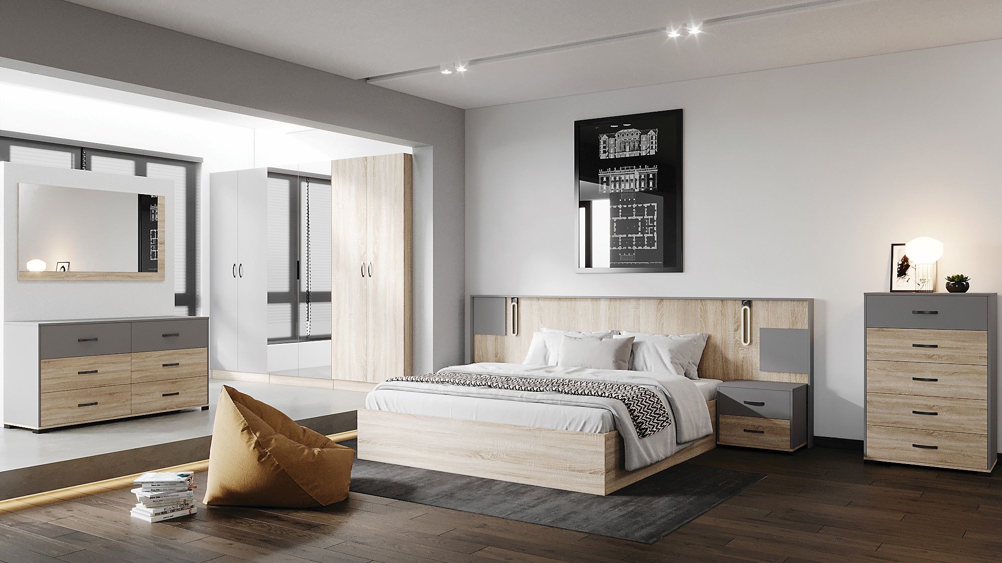 Σετ υπνοδωματίου, σε απόχρωση 0162 Graphite Grey και K360 Vintage Harbour Oak.