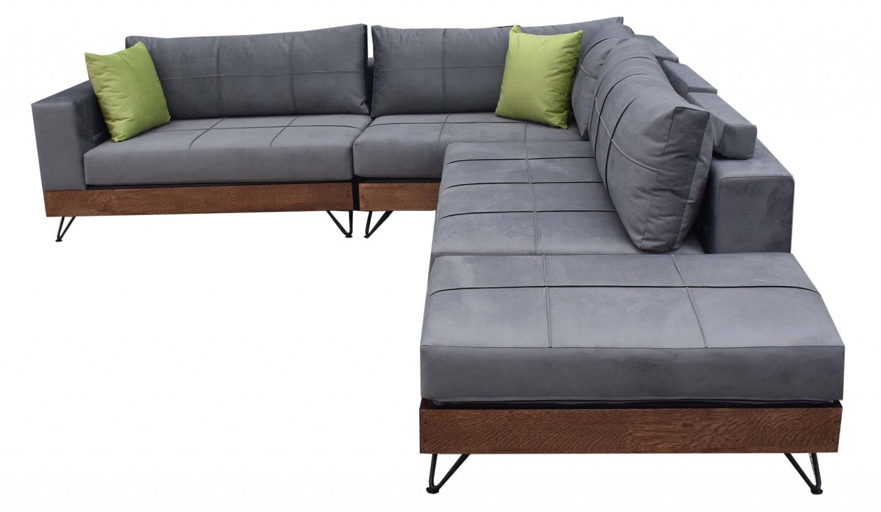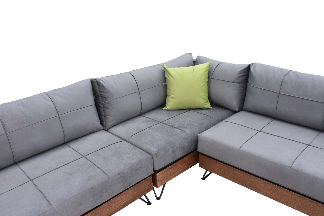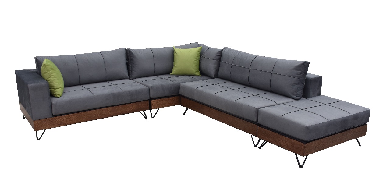 Σύστημα καναπέ αποτελούμενο από τέσσερα (4) τεμάχια, με δυνατότητα τοποθέτησης της γωνίας αριστερά ή δεξιά, εύκολα και γρήγορα, με μια απλή μετακίνηση των τεμαχίων. Με ξύλινη βάση περιμετρικά. Μεγάλα μαξιλάρια με διακοσμητικές λεπτομέρειες από γαλλική ραφή.