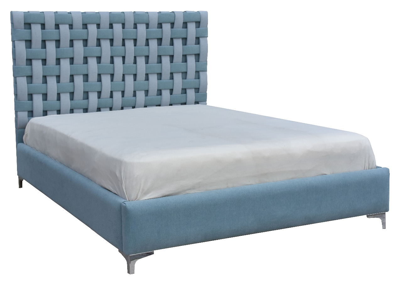 Κρεβάτι με ιδιαίτερο κεφαλάρι αποτελούμενο από καρό αραιή πλέξη.