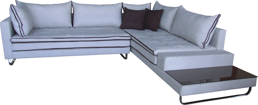 Γωνιακός καναπές με ενσωματωμένο βοηθητικό τραπεζάκι. Μαξιλάρι καθίσματος και ανώστρωμα για περισσότερη άνεση. Διακοσμητικές λεπτομέρεις με ρέλια.