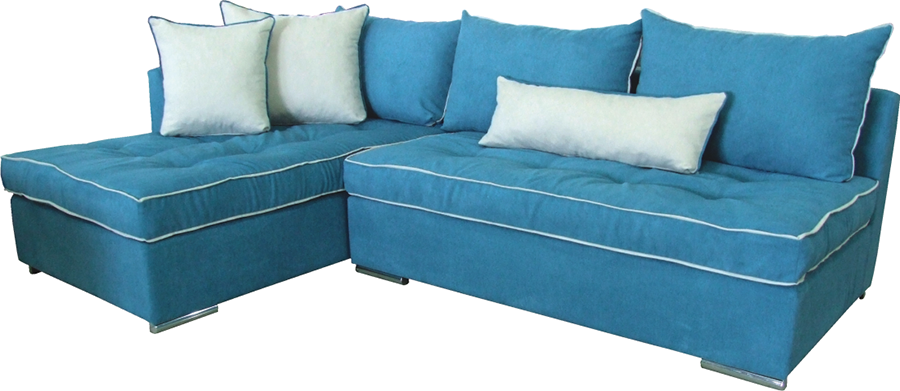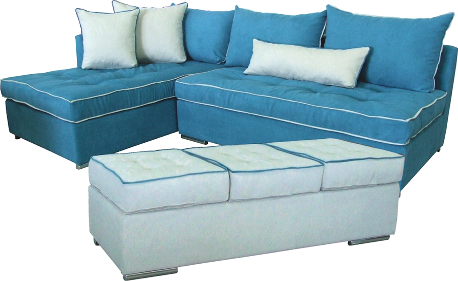 Γωνιακός καναπές, με μεγάλο ανεξάρτητο σκαμπό. Μαξιλάρια με διακοσμητικά ρέλια. Το ύφασμα, τα χρώματα, οι διαστάσεις και η φορά του καναπέ, μπορούν να αλλάξουν ανάλογα με τις ανάγκες σας.