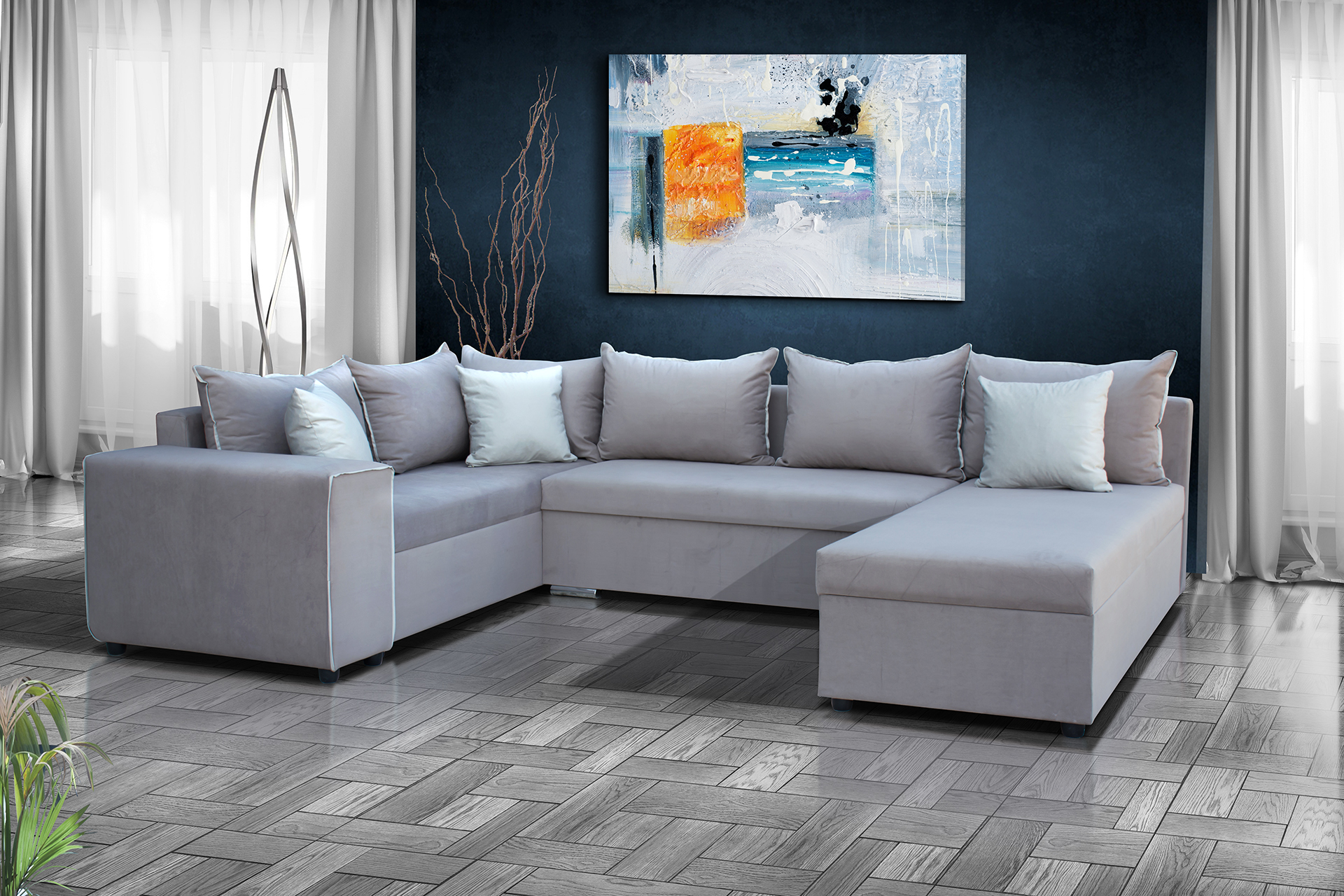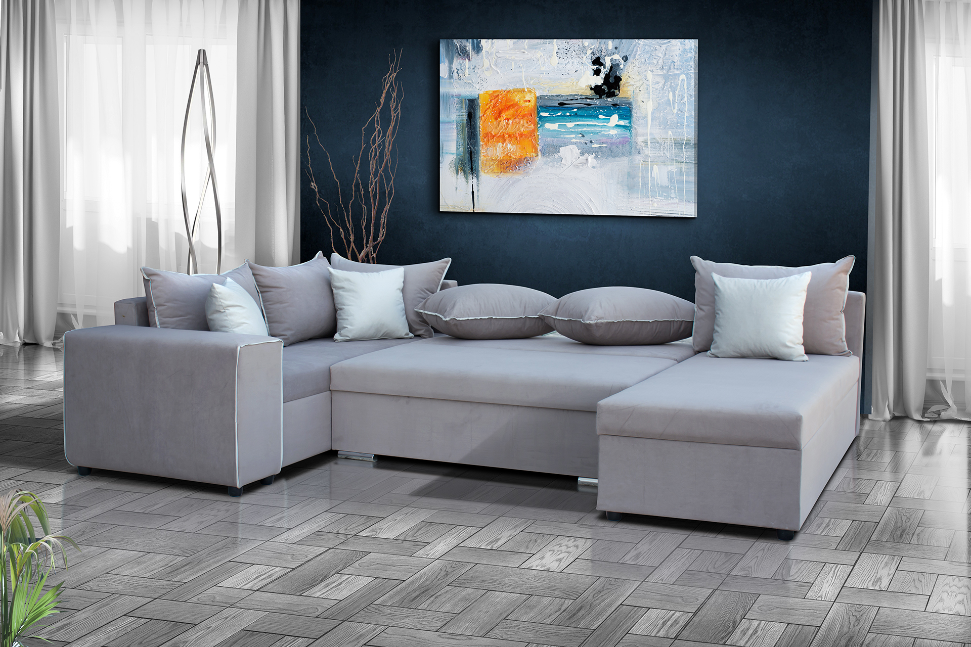 Γωνιακός καναπές κρεβάτι σε διάταξη Π, με τρεις αποθηκευτικούς χώρους.
