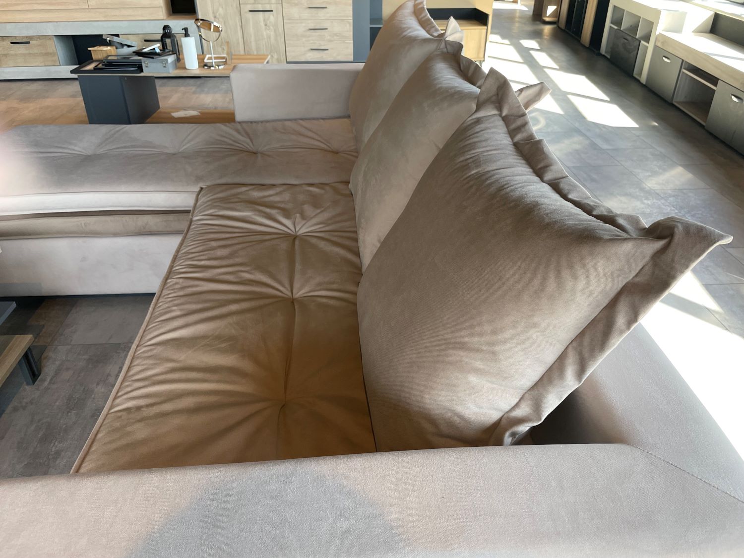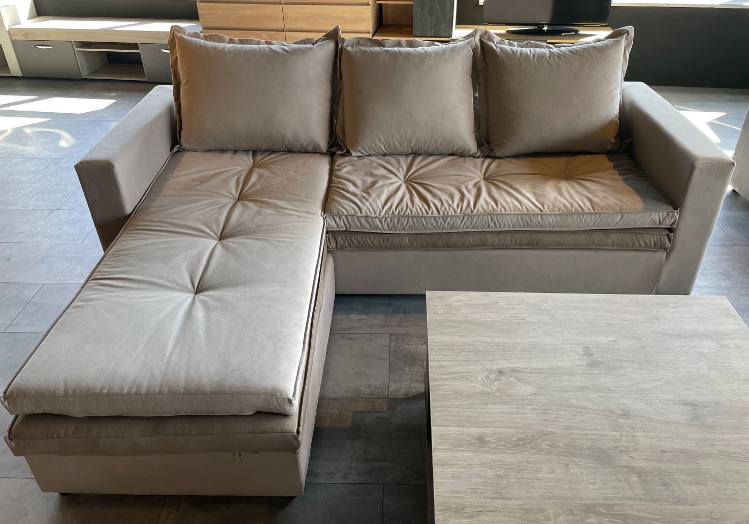 Γωνιακός καναπές με αναστρέψιμη γωνία, σε μίνιμαλ μοντέρνο ύφος. Διπλά μαξιλάρια καθίσματος σε διαφορετικό χρώμα. Αλλάζοντας τη θέση τους (το κάτω-πάνω και το πάνω-κάτω) αλλάζει η συνολική εικόνα του καναπέ.