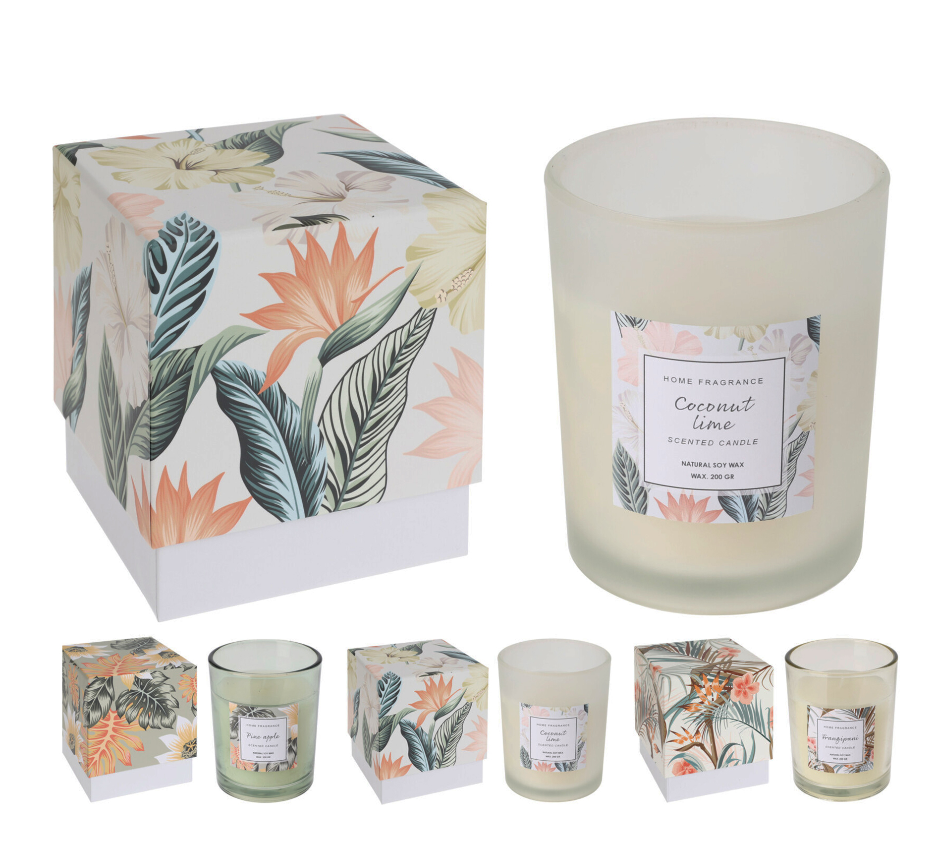Αρώματiκό κερί σε συσκευασία δώρου με εξωτικά λουλούδια. Αρώματα : Λευκό χρ.: Cocomint(Καρύδα), Χακί χρ.: Frangipani (Φούλι), Πράσiνο χρ.: Pineapple(Ανανάς)