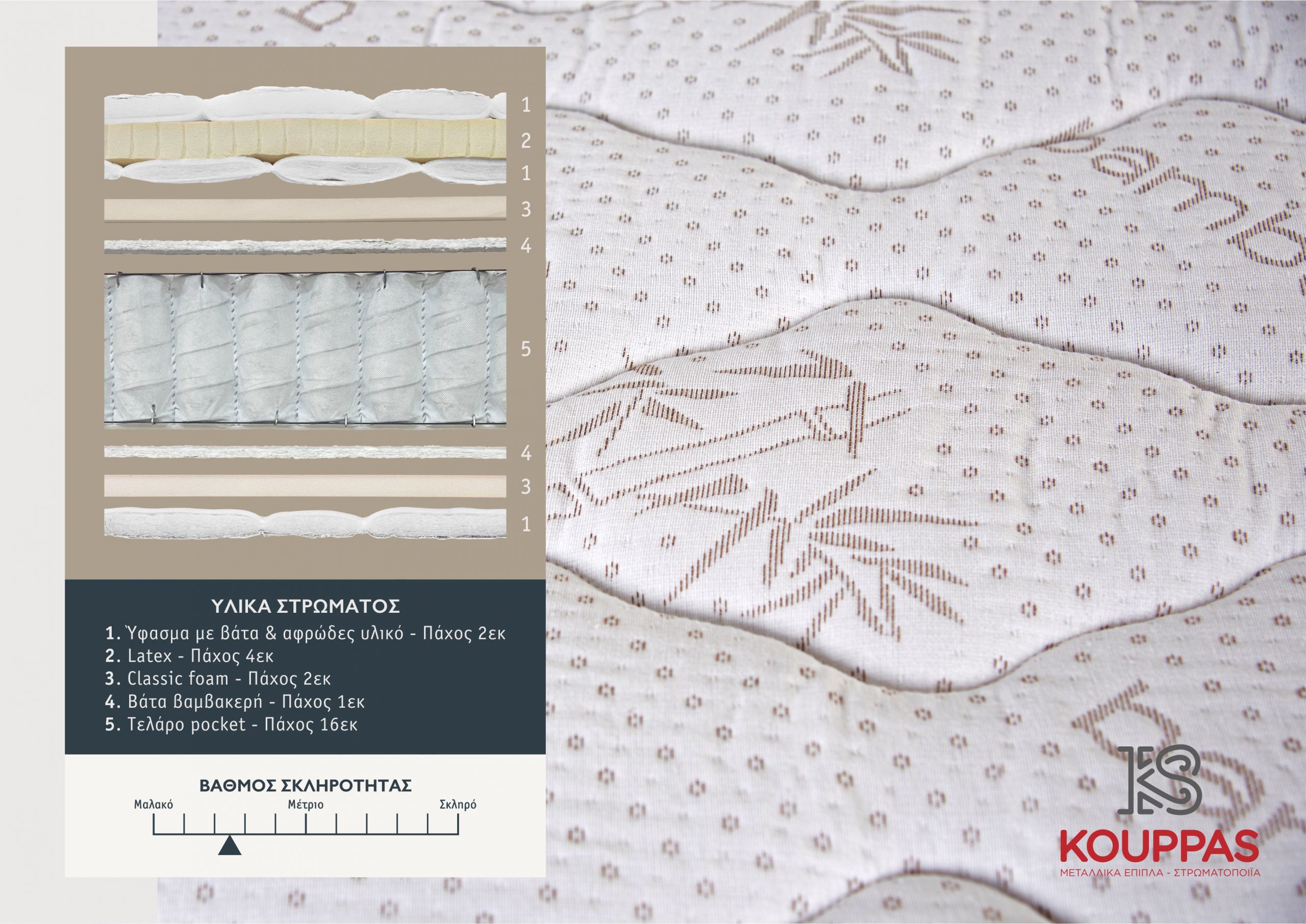 Ανεξάρτητα ελατήρια τύπου Pocket Spring, που φιλοξενούνται ξεχωριστά σε υφασμάτινους θύλακες, έτσι ώστε να εξασφαλίζεται η μέγιστη ανατομική συμπεριφορά του στρώματος.