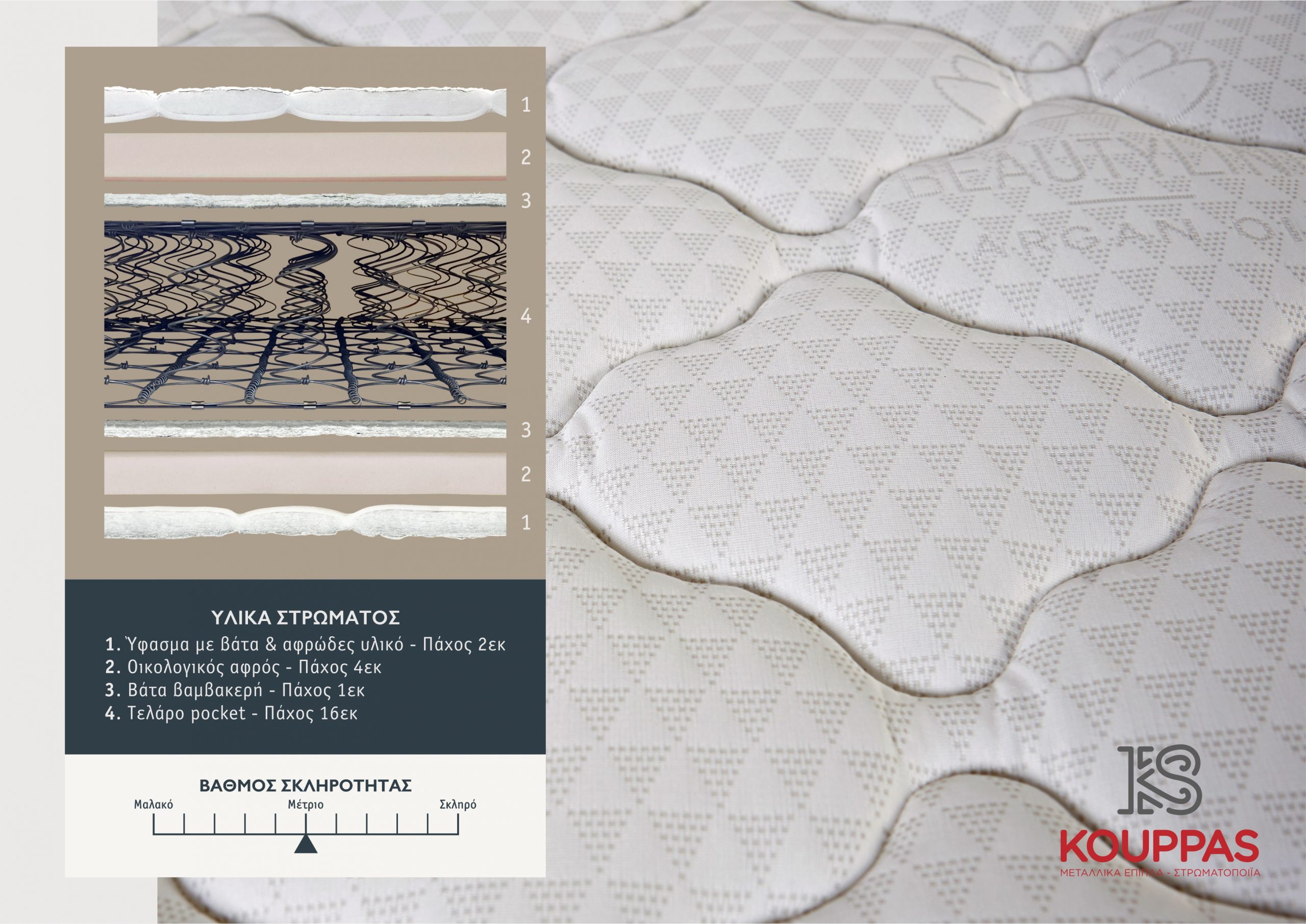 Βαμβακερη βάτα και αφρώδες υλικό εξαιρετικής αντοχής, που προάγει τη διατήρηση της ομοιομορφίας του στρώματος και συμβάλει στην ανάδειξη της ανατομικης του συμπεριφοράς.