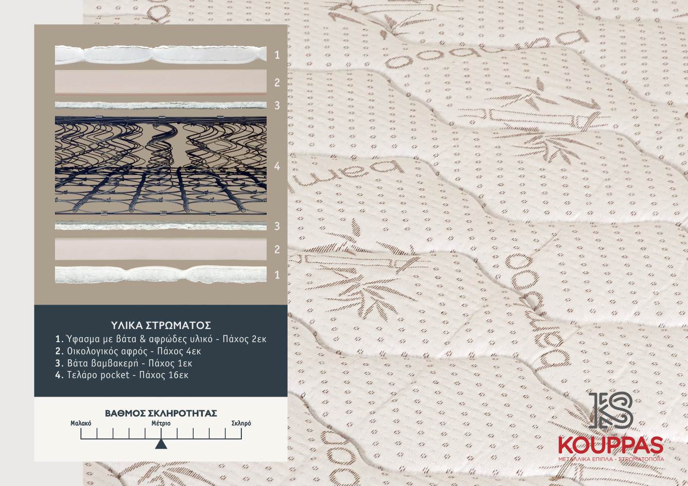 Αφρώδες υλικό εξαιρετικής αντοχής, που προάγει τη διατήρηση της ομοιομορφία του στρώματος και συμβάλει στην ανάδειξη της ορθοπεδικής του συμπεριφοράς.