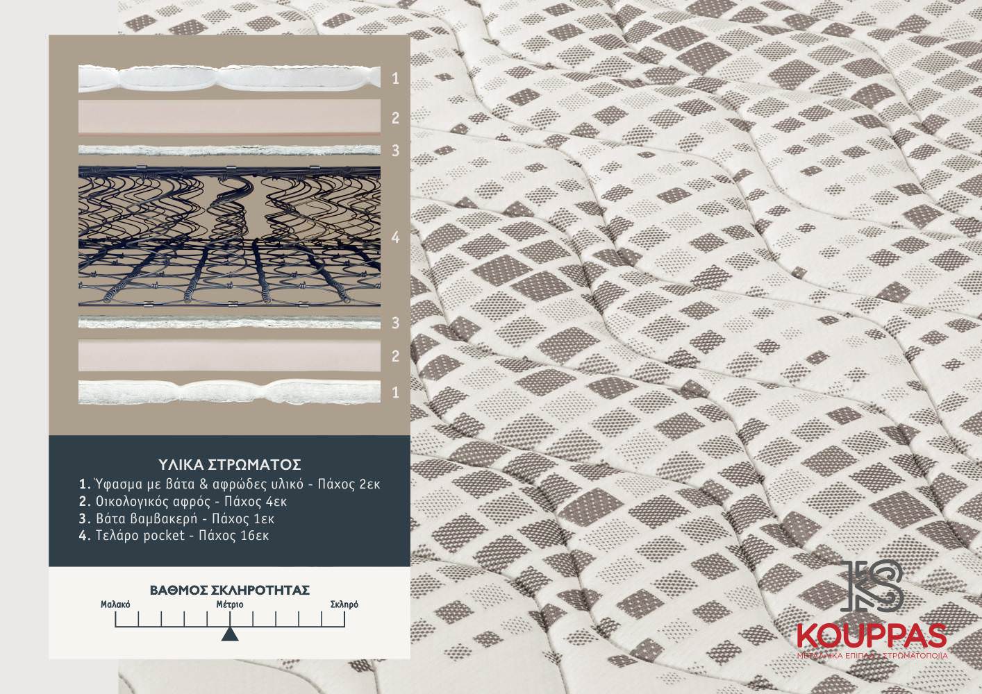 Βαμβακερή βάτα και αφρώδες υλικό εξαιρετικής αντοχής, που προάγει την διατήρηση της ομοιομορφίας του στρώματος και συμβάλει στην ανάδειξη της ορθοπεδικής του συμπεριφοράς.