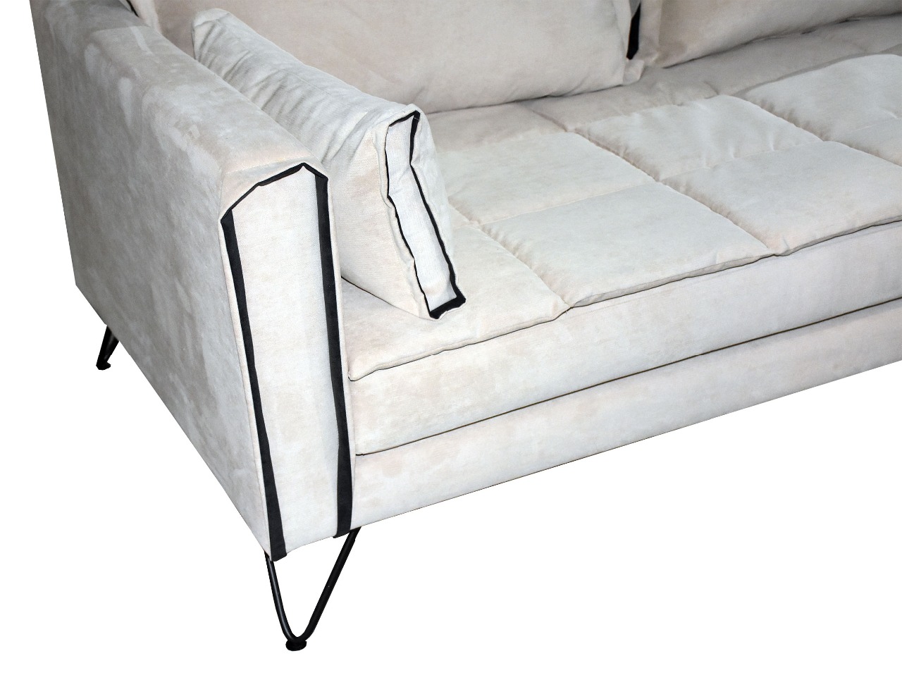 Γωνιακός καναπές με κάθισμα με μαξιλάρι και επιπλέον καπιτονέ ανώστρωμα. Διακοσμητικές λεπτομέρειες με ρέλι στο σκελετό και τα μαξιλάρια πλάτης.