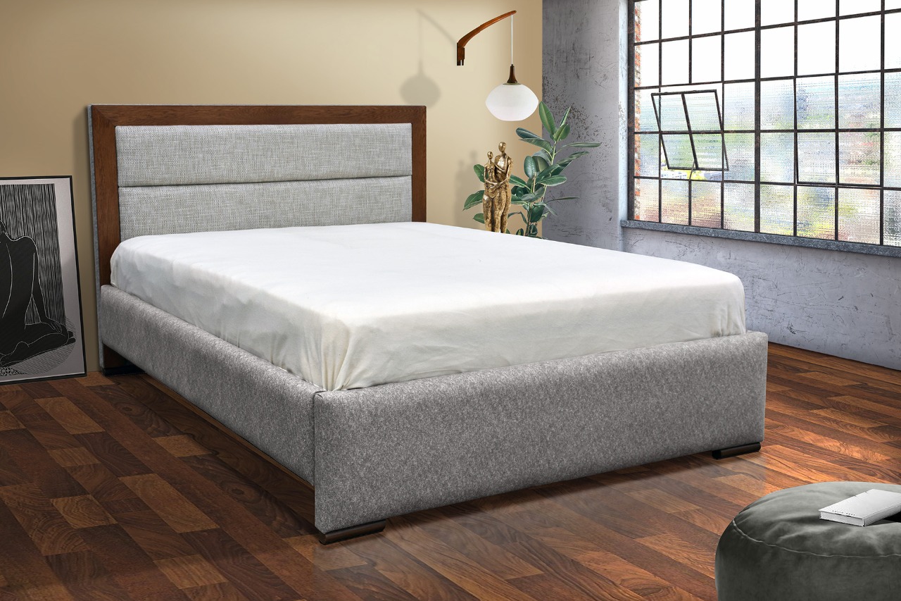 Κρεβάτι, σε μοντέρνο ύφος που συνδιάζει ξύλο και ύφασμα. Το κεφαλάρι εσωτερικά είναι ντυμένο με ύφασμα με οριζόντια χωρίσματα και περιμετρικά φέρει κορνίζα από φυσικό ξύλο.